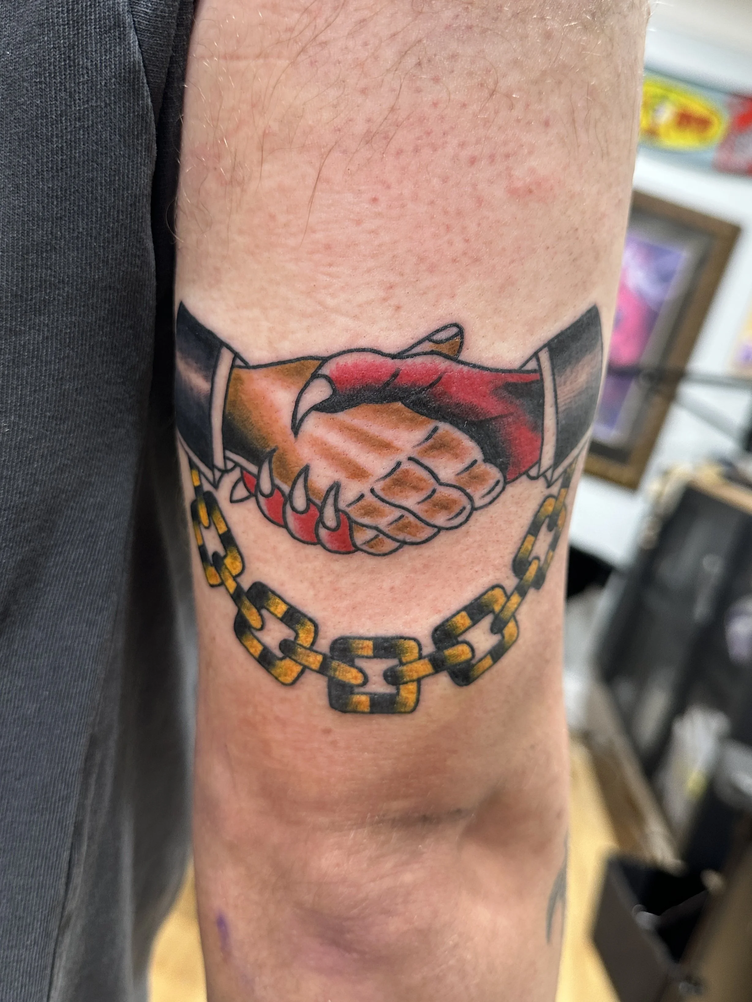 Tattoo of two hands shaking, one with red skin and black claws, and the other with a chain below, on a person's upper arm.