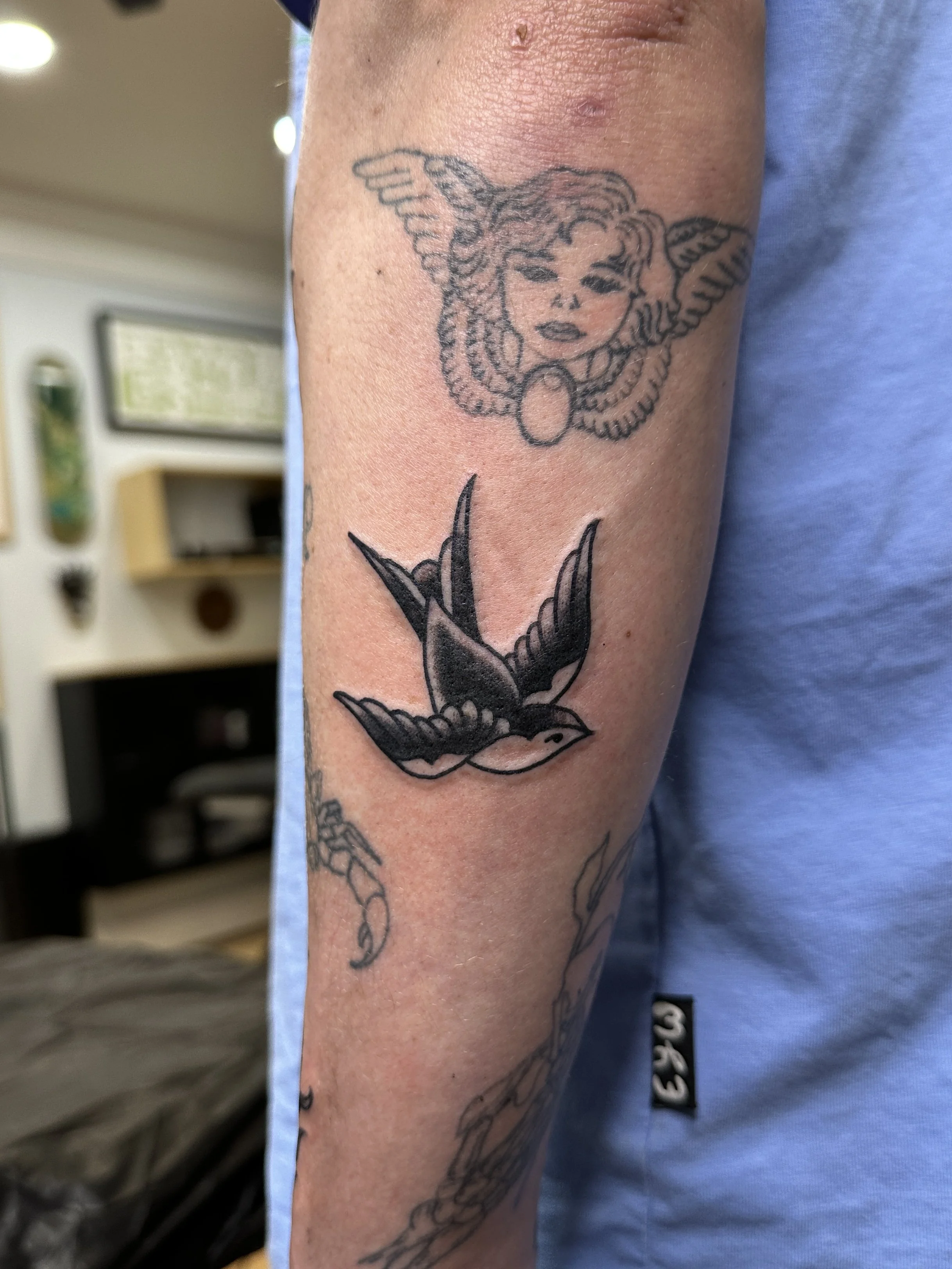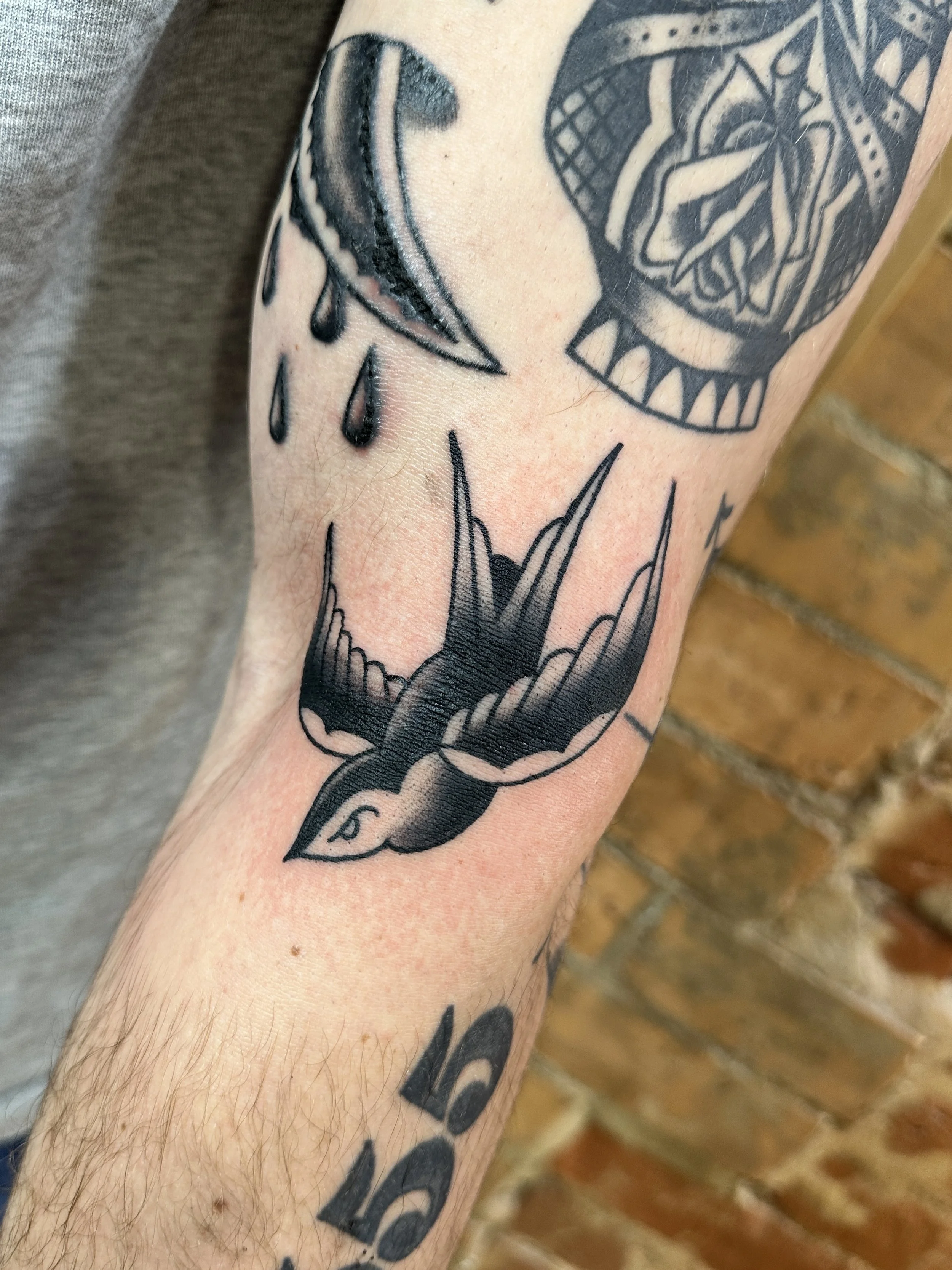 Tattoo of a bird in flight on person's forearm, with additional tattoo designs including a moon with melting drops and a geometric face in black ink.