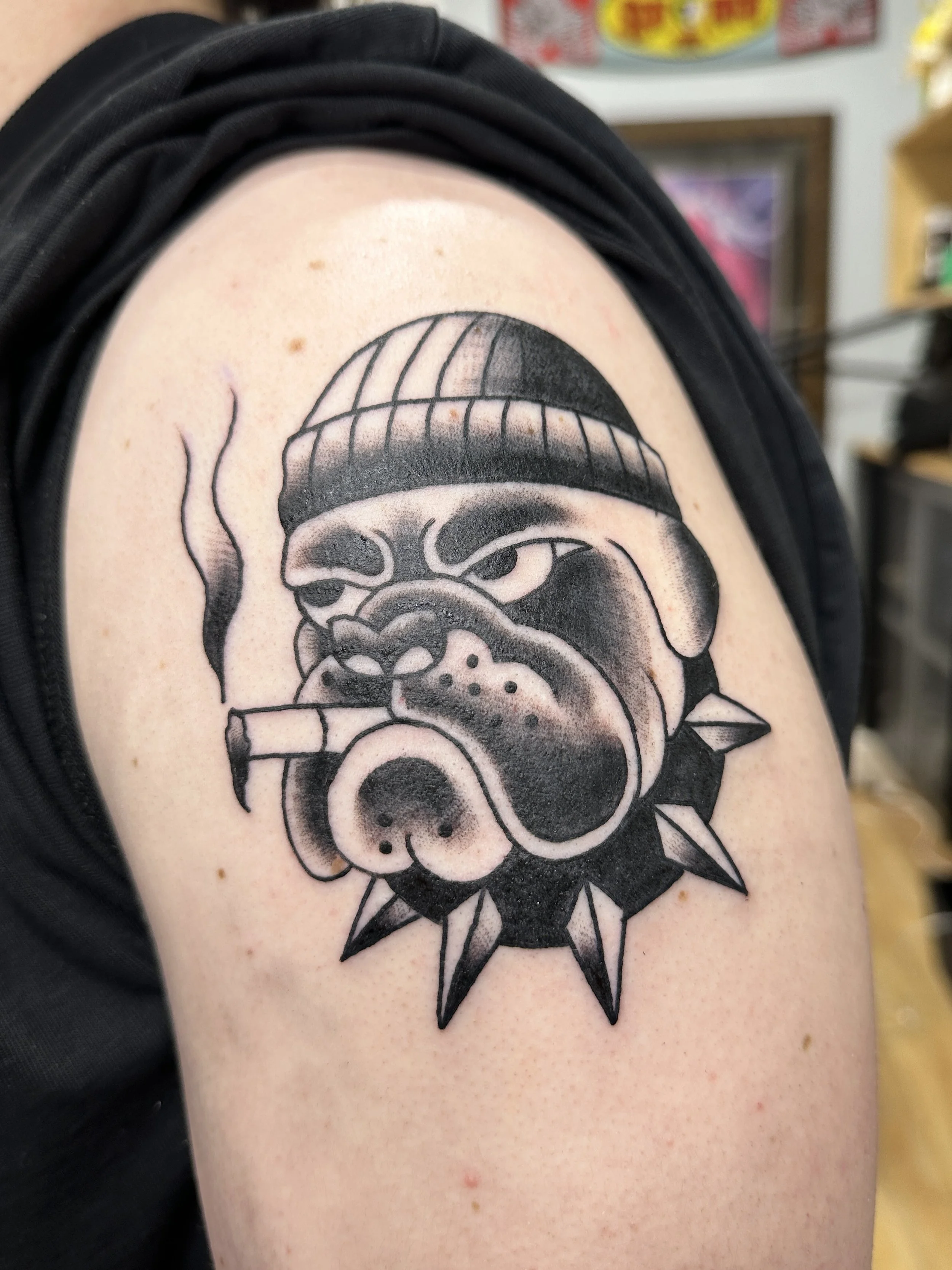Black and gray tattoo of a pig with sunglasses smoking a cigarette, wearing a beanie, with a spiked collar, and a background of a spiked circle.