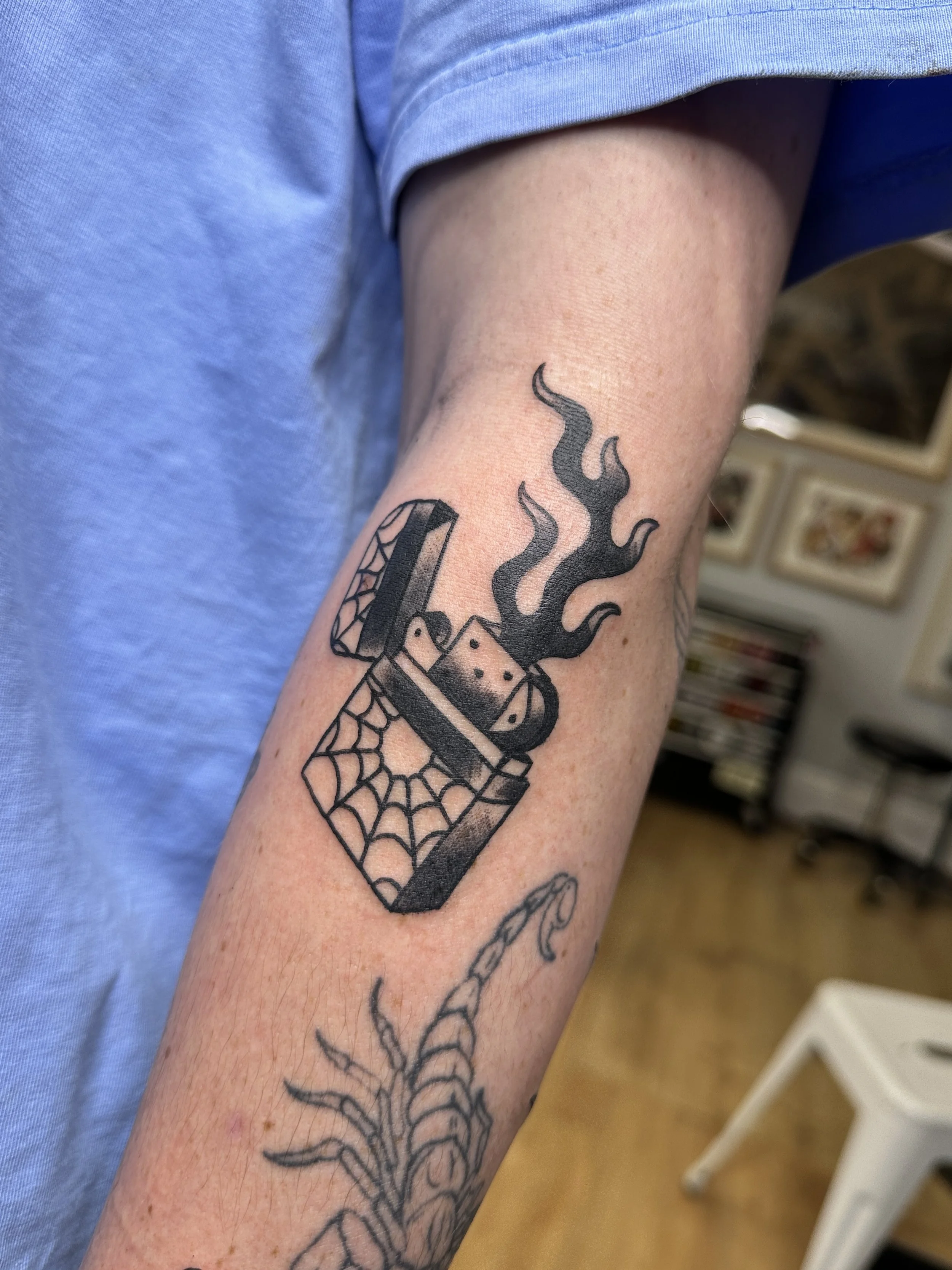 Tattoo of a lighter with a spider web design on the side, flames coming from the top, and some flames and a tentacle or plant below on the person's arm.