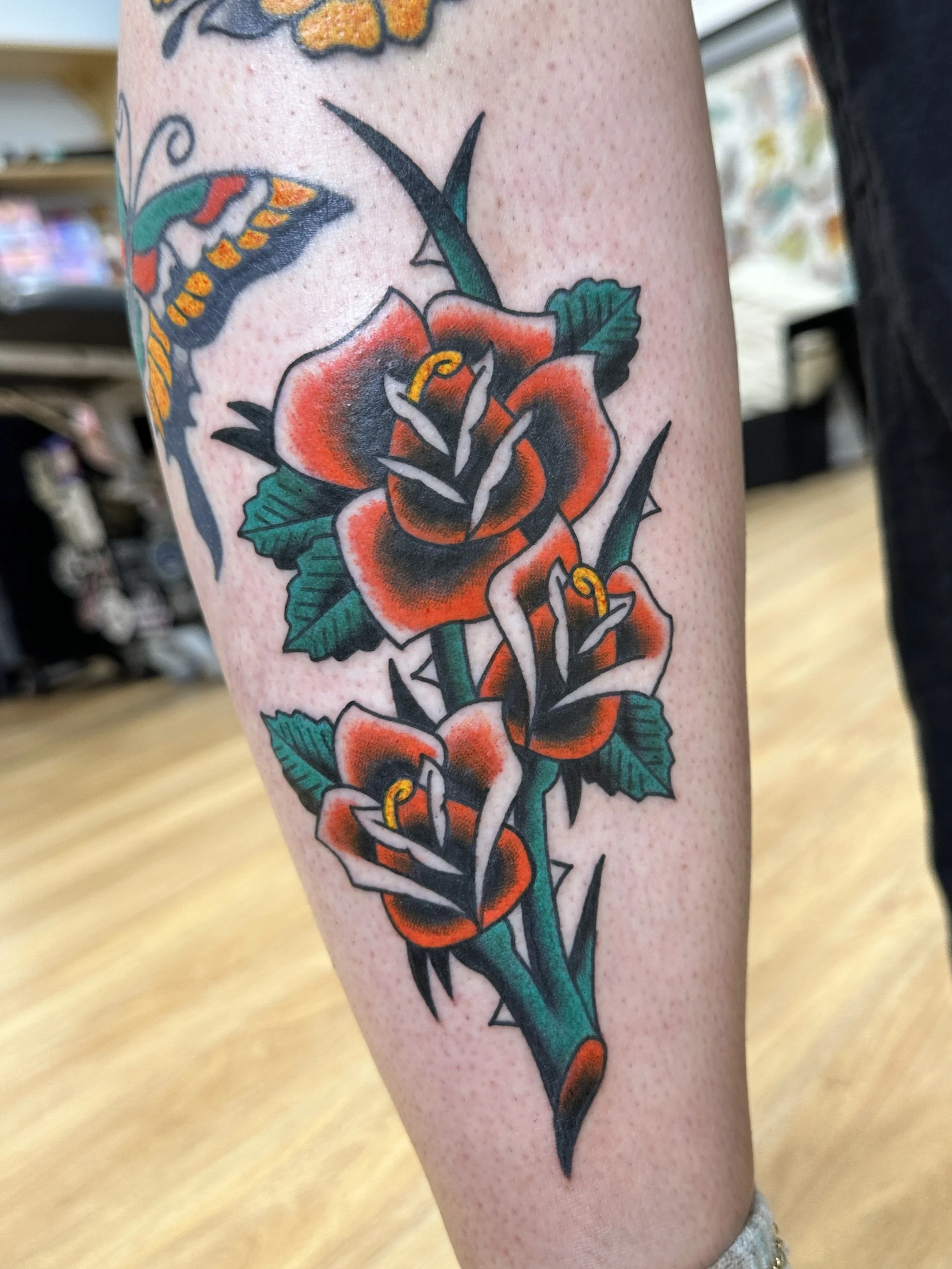 Tattoo of three red roses with black shading, green leaves, and a stem, on a person's arm.