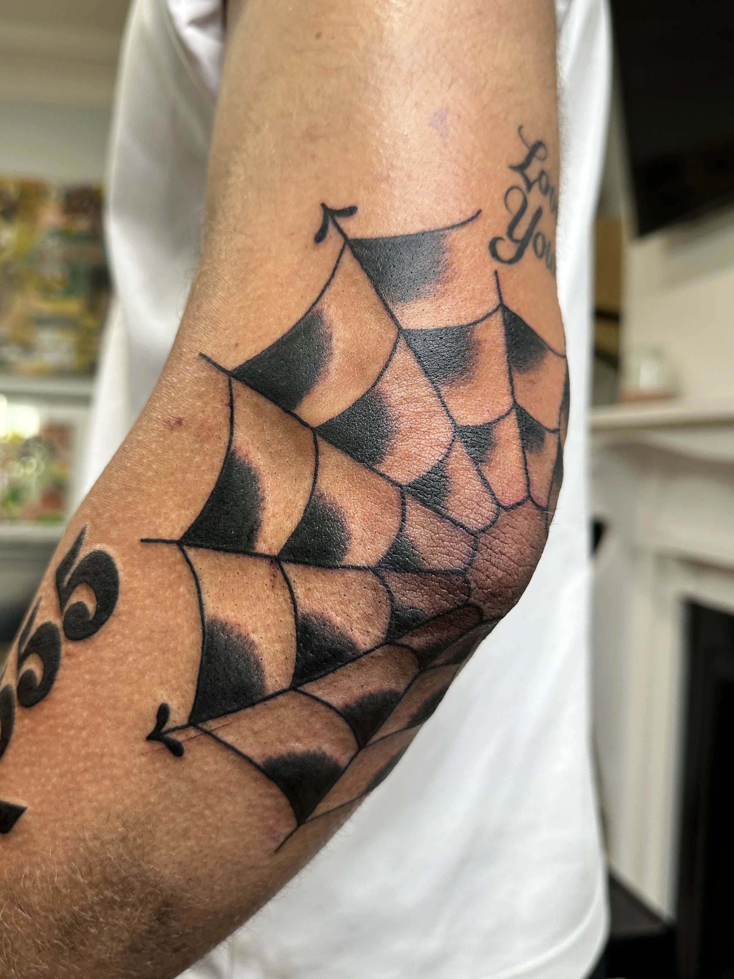 Tattoo of a spider web on the forearm with shadow shading, and part of the phrase "Do You" visible above the web.